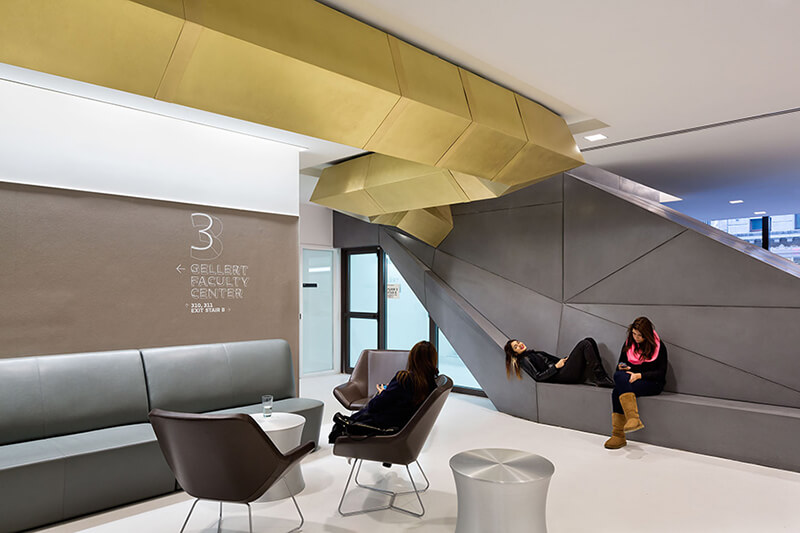 In The New School University Center in New York, designed by SOM, fire-rated glazing helps turn a frequently traversed fire-rated stairwell into a central design element. SOM used Technical Glass Products' (TGP) Pilkington Pyrostop® fire-resistive-rated glass and Fireframes® Heat Barrier Series fire-rated frames with custom corners and angles to mirror the stairwell's elevations and diagonal trajectories. This design treatment gives movement to the vertical academic building and transforms a code-driven application into a point of visual engagement.