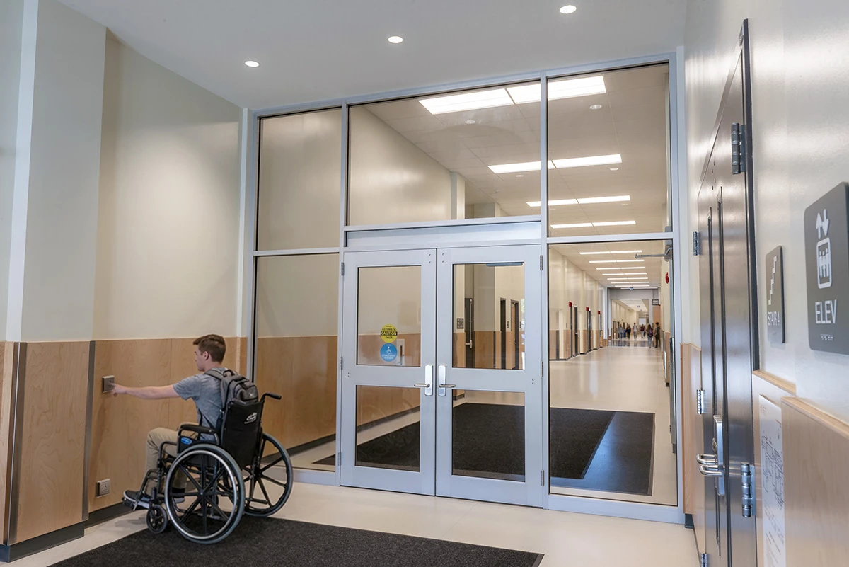 Originally engineered with concealed overhead stops, the school board requested the door’s hardware be changed to Glynn-Johnson 90 Series, a surface mounted door stop system. The machining needed for the new closers was different than what was originally planned, so the engineering and manufacturing teams at TGP had to pivot post-fabrication of the original specifications to ensure the doors were manufactured, shipped and installed on time. According to Luther, making the change in hardware required not only effective and quick communication but also the nimbleness to accommodate. Since all of TGP’s systems are custom built for individual projects, multiple departments needed to collaborate and communicate to ensure this seemingly small change in detail was handled accurately and did not impact the functionality of the project’s multiple fire-rated door systems.