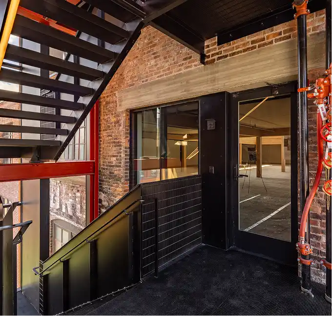 Description: An external, glass-enclosed fire-rated stairwell system enabled a historic building to meet modern life-safety codes while maximizing daylight, views, and architectural cohesion in a tight urban context.