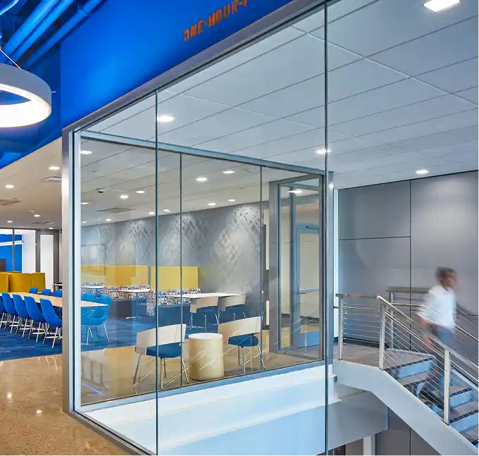 Description: TGP’s fire-rated glass and framing systems were used to meet life-safety codes while preserving an open, light-filled design that promotes STEM visibility, collaboration, and connectivity.